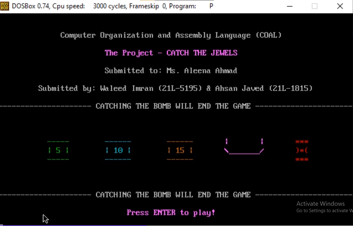 A console-based game that contains two entities; bucket and jewels as rewards. The rewards worth 5, 10, and 15 points. The goal is to prevent bomb and collect as many rewards as possible in 2 minutes.